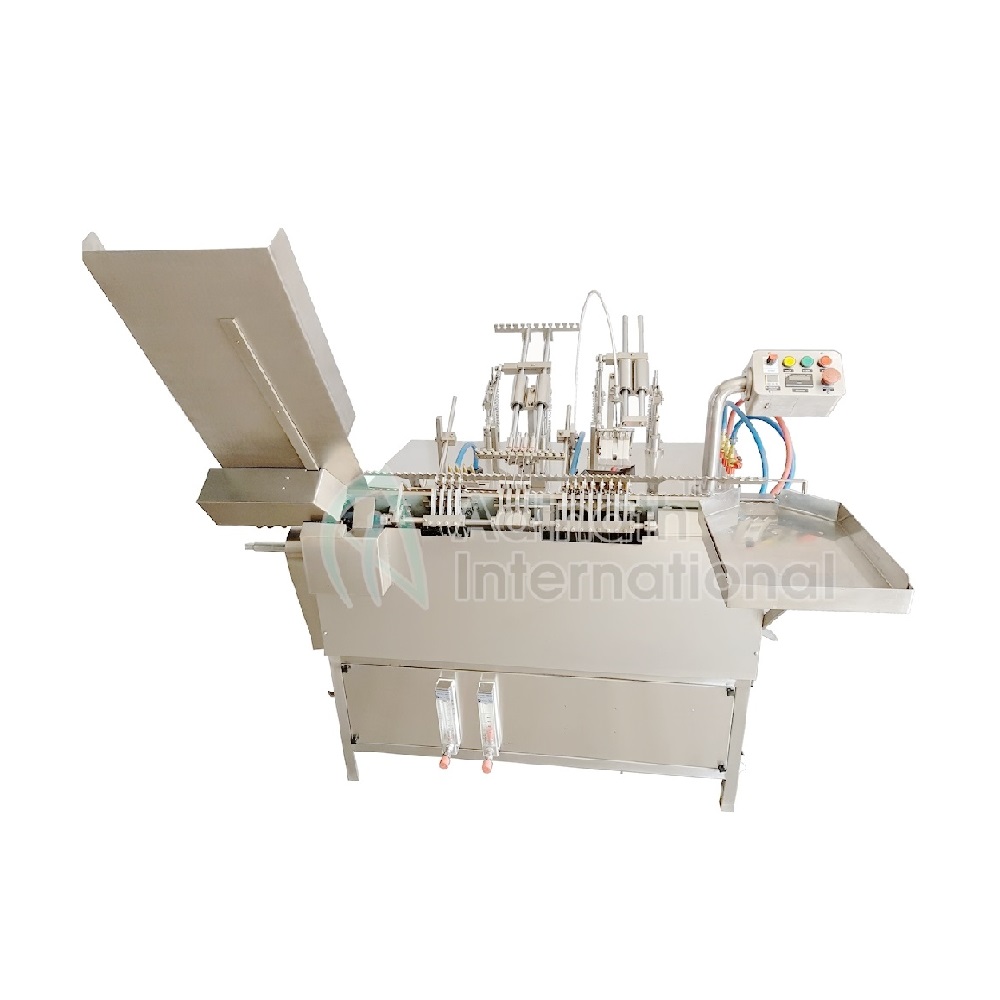During the stoppage of rack sequentially pre-gassing, filling, post gassing, pre-heating and final sealing is achieved. Duly filled sealed ampoules then collected on collection tray automatically without hand touch.